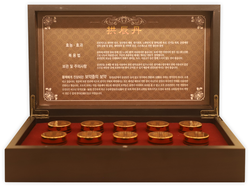 공진단은 원나라 위역림(危亦林)이5대째 가문 대대로 내려온 처방을 근거로 편찬한 세의득효방(世醫得效方)에서 유래한 처방으로서 주원료가 녹용, 사향, 산수유, 당귀 등의 귀한 약재로 정성껏 만든 명방 중의 명방이며 옛 원나라의 황실에 진상되었던 귀족적인 보약중의 보약입니다.